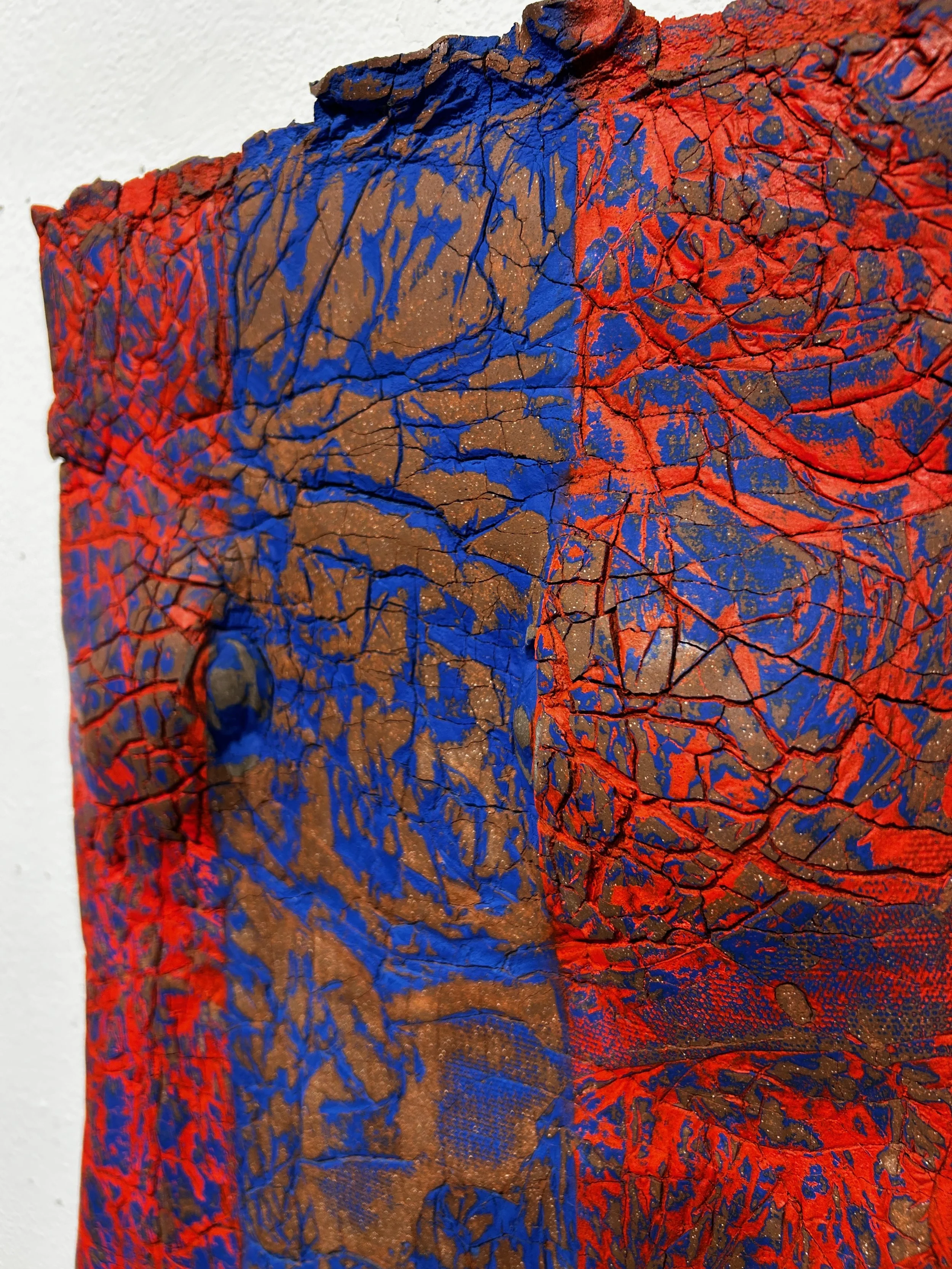 GAIA, 3/4 View Detail, 2025, 18X13X3”, Low Fire Ceramic, mounted on wood, Photo - Courtesy of the Artist